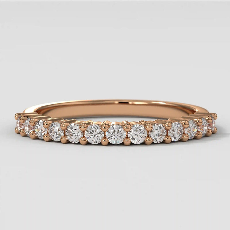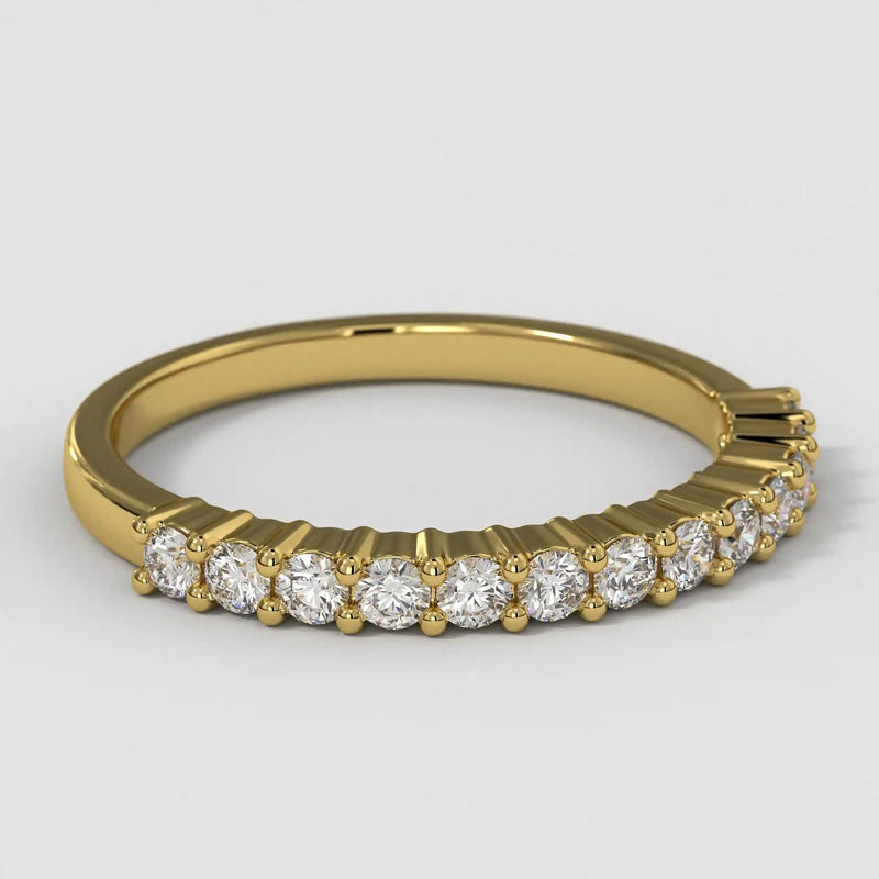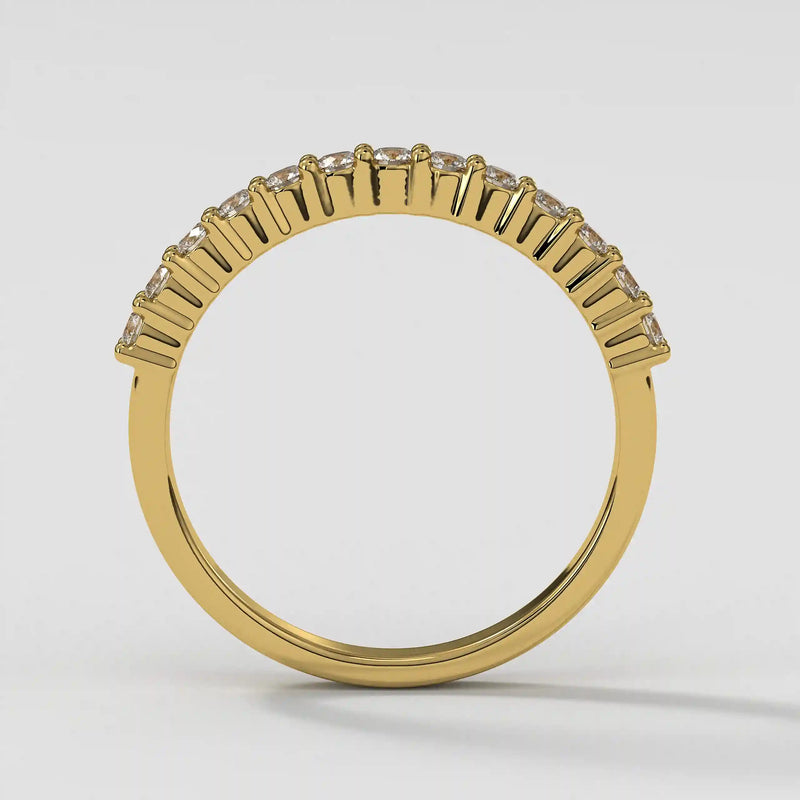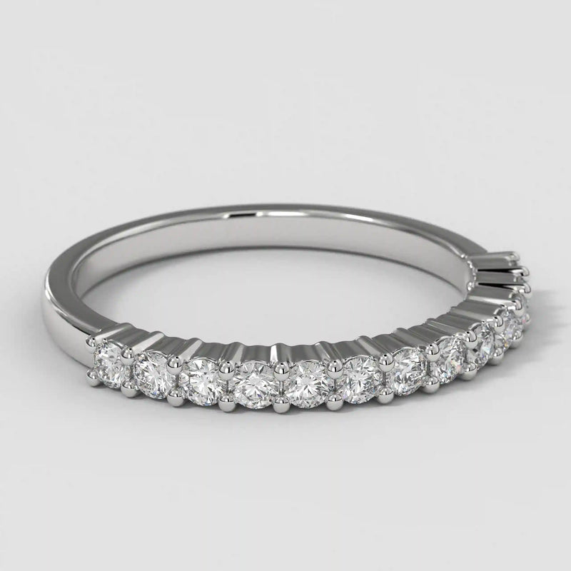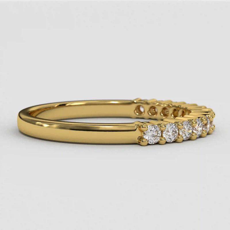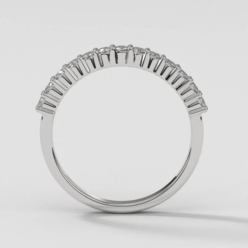 The Half Eternity Band symbolizes an unbreakable bond of devotion, expertly crafted with a refined, opulent finish and a distinguished round profile. Meticulously designed for a lifetime of brilliance, this wedding band seamlessly combines sophistication with enduring strength.