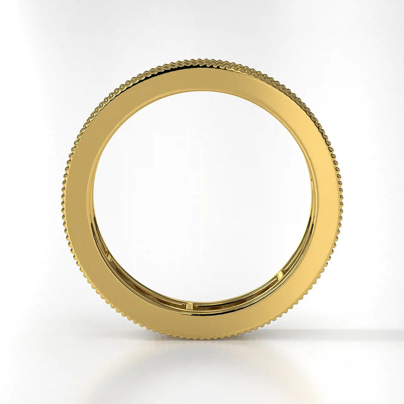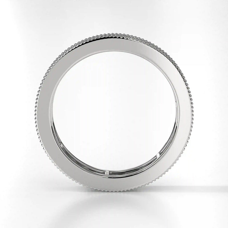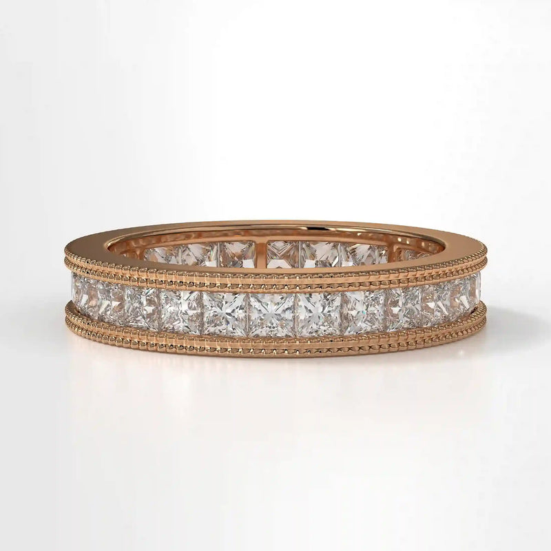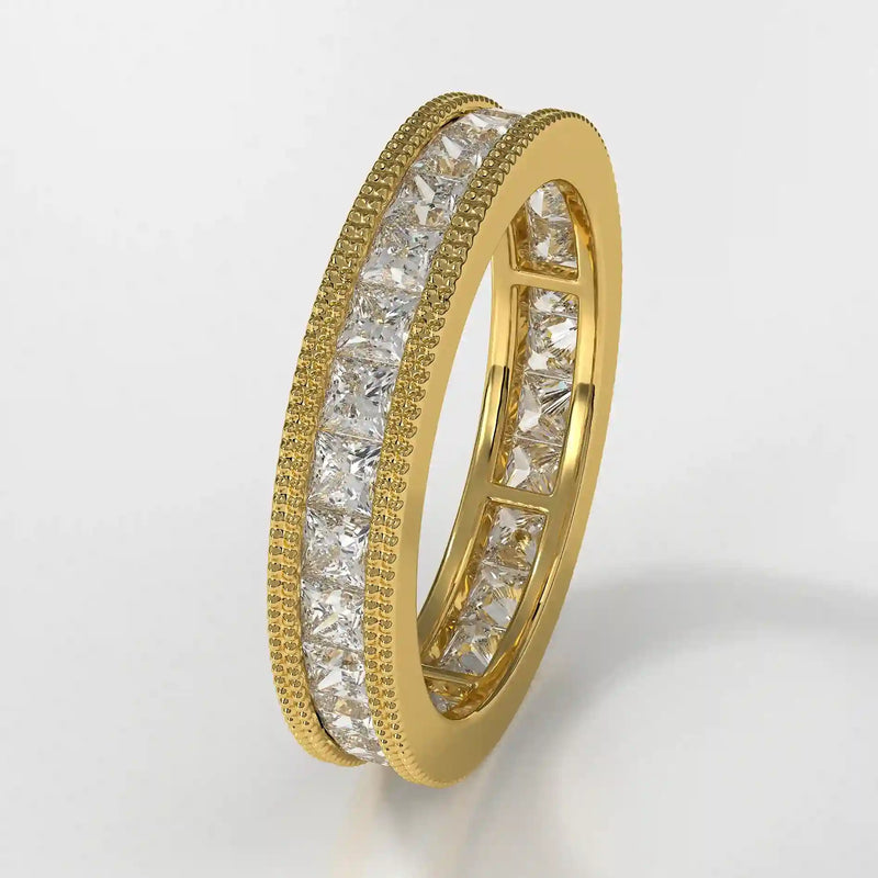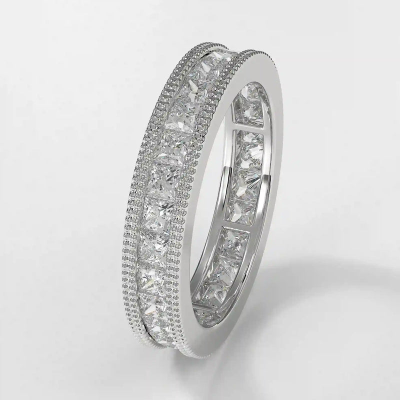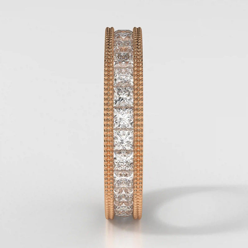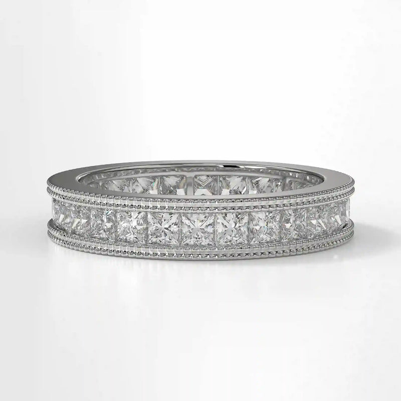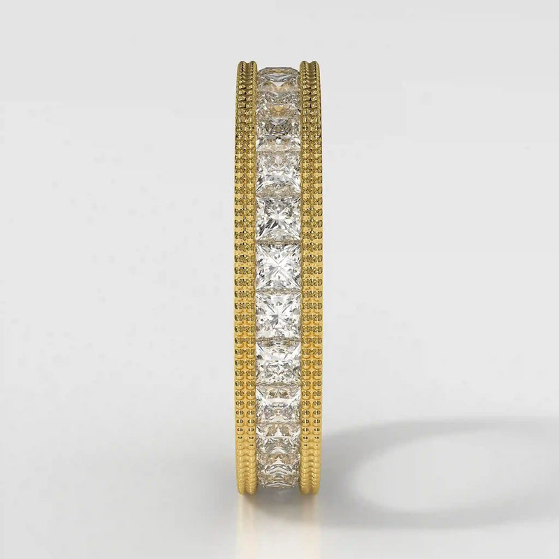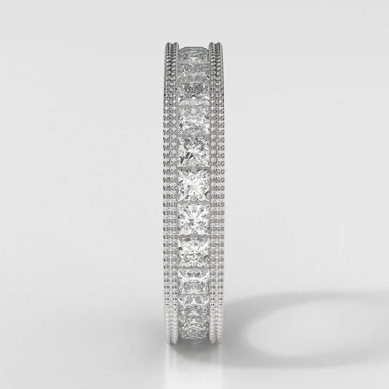 Indulge in the pinnacle of refinement with The Milgrain Princess Eternity Band, a stunning piece that seamlessly blends a luxurious design with a striking princess silhouette.