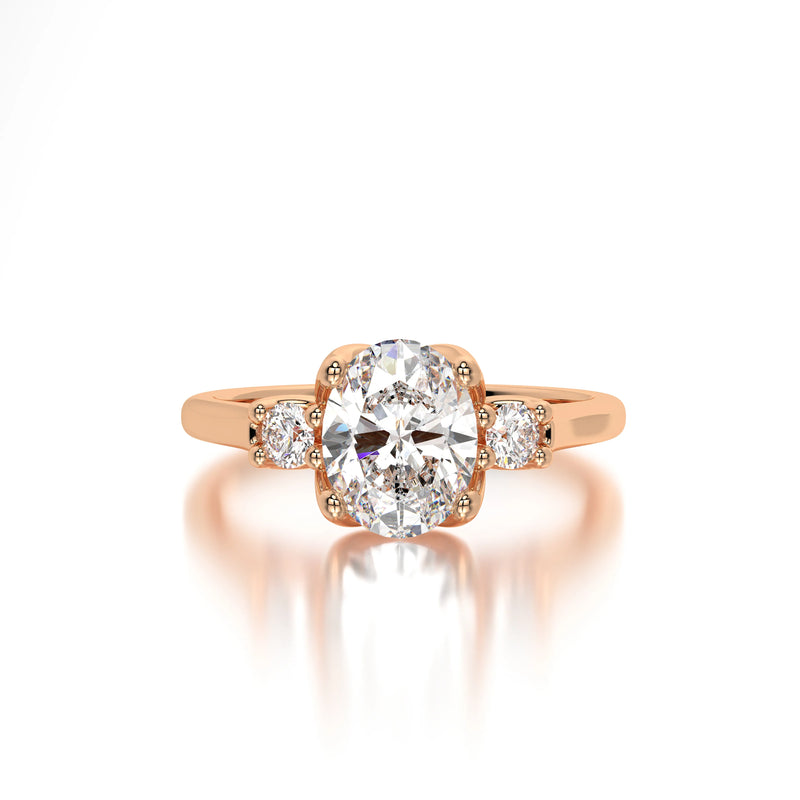 The Oval Lotus is a breathtaking tribute to love, showcasing a mesmerizing oval diamond in a three stone setting. Every facet reflects brilliance, making this engagement ring the ultimate symbol of commitment.