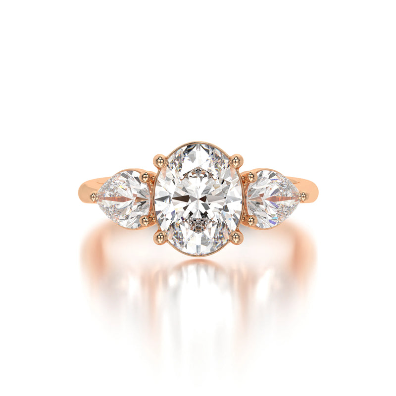 The Oval Pear Trio is a breathtaking tribute to love, showcasing a mesmerizing oval diamond in a three stone setting. Every facet reflects brilliance, making this engagement ring the ultimate symbol of commitment.
