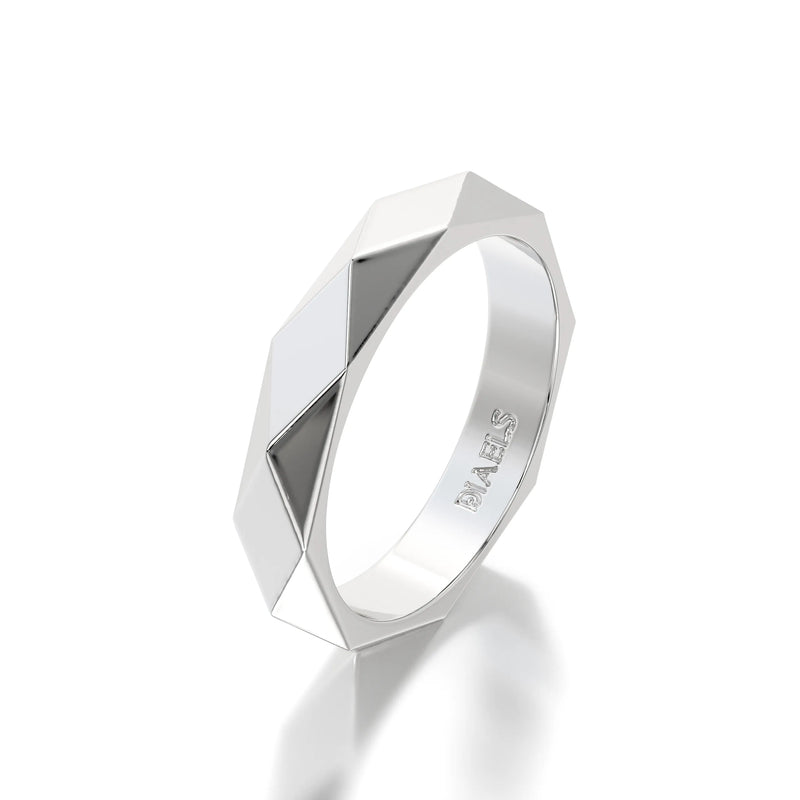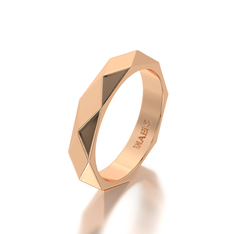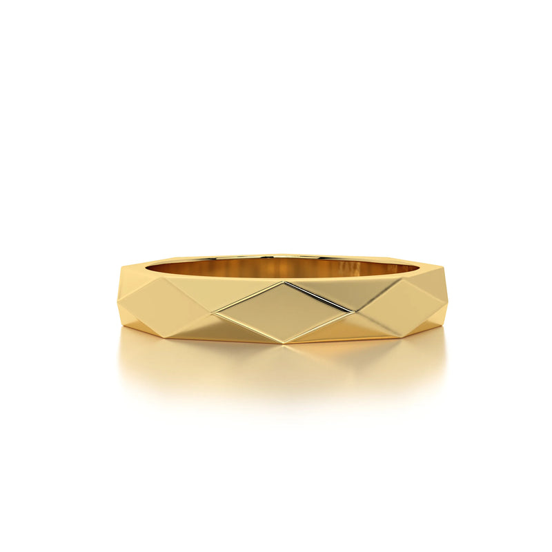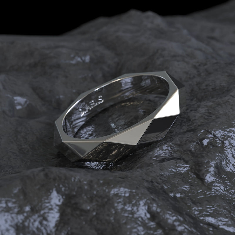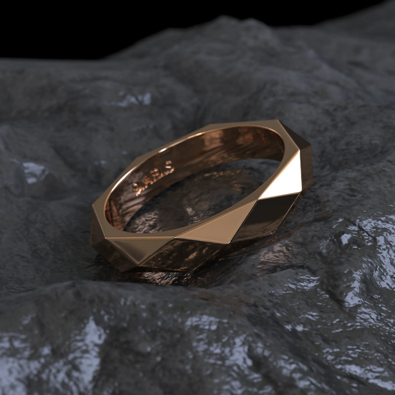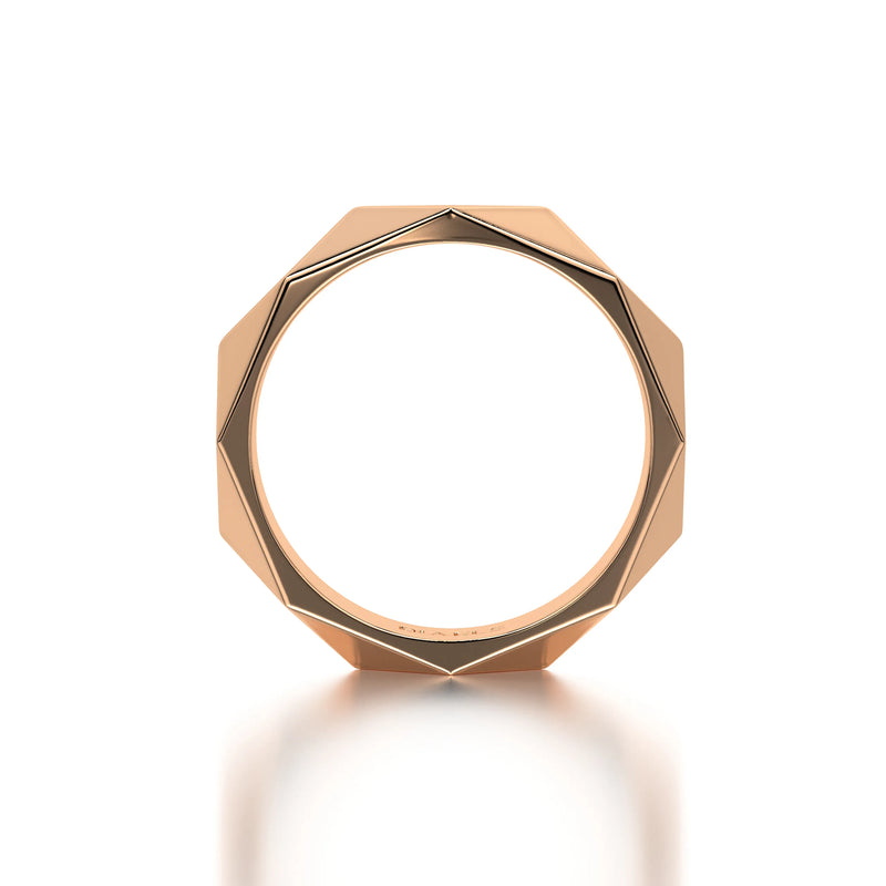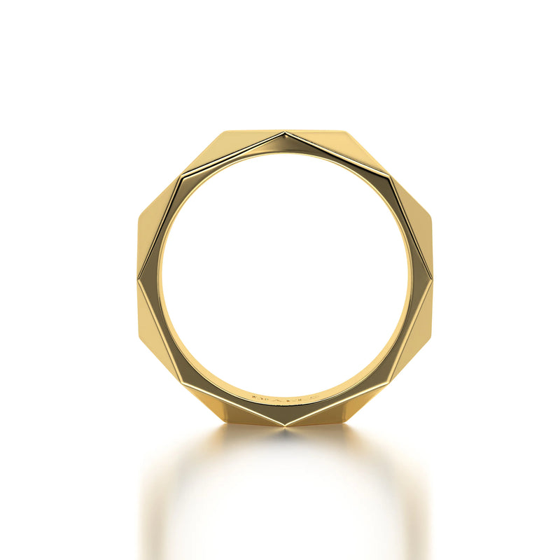 The Prism Gold Band is a bold and modern men's wedding band featuring a faceted geometric design that reflects light from every angle. Crafted from solid gold, this unique band blends contemporary architecture with timeless elegance. Perfect for those who appreciate sharp, distinctive style and lasting sophistication.